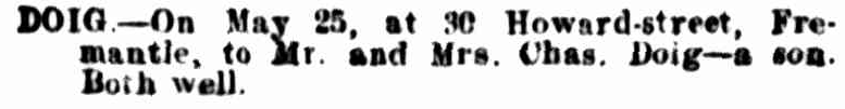 Doig was born on 25 May 1913 to Charles George Alexander Doig and his wife, Isabella Brand Doig (née Miller), at their residence at 30 Howard Street, Fremantle. He had an elder sister Linda (b 1910) and a younger brother, Charles (1912-1944).