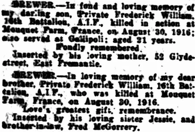 1926 Killed In Action. In fond and loving memory of my darling son, Private Frederick William Brewer, 16th Battalion, A.I.F., killed in action at Mouquet Farm, France, on August 30, 1916; who served at Gallipoli; aged 21 years. Fondly remembered. Inserted by his loving mother, 52 Glyde street, East Fremantle… In loving memory of my dear brother, Private Frederick William, 16th Battalion, A.I.F.-Inserted by his loving sister Jessie, and brother-in-law, Fred McGorrery. (reference)