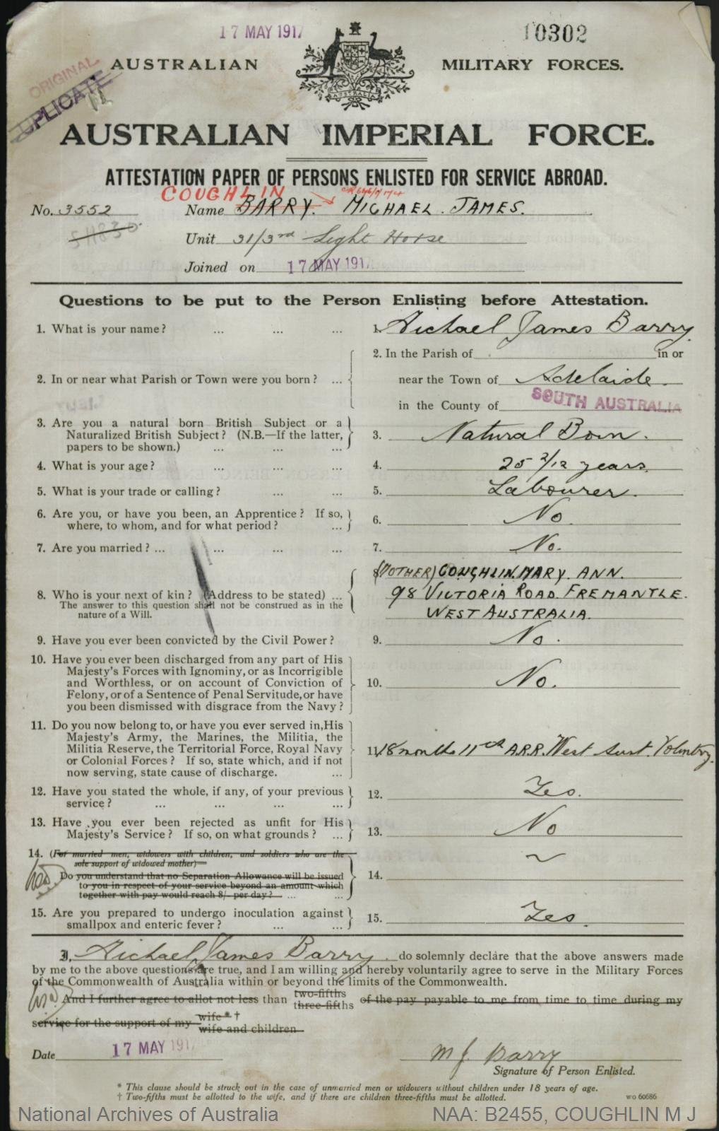 Next of Kin: Mother, Mrs Mary Ann Coughlin