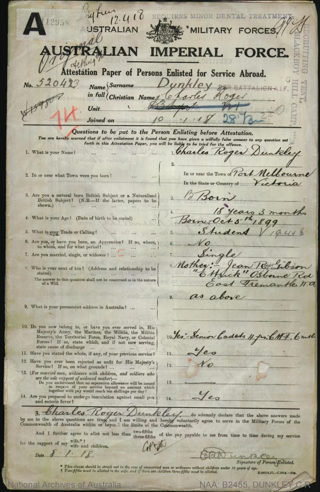 DUNKLEY, Charles Roger, Private, 28th Battalion