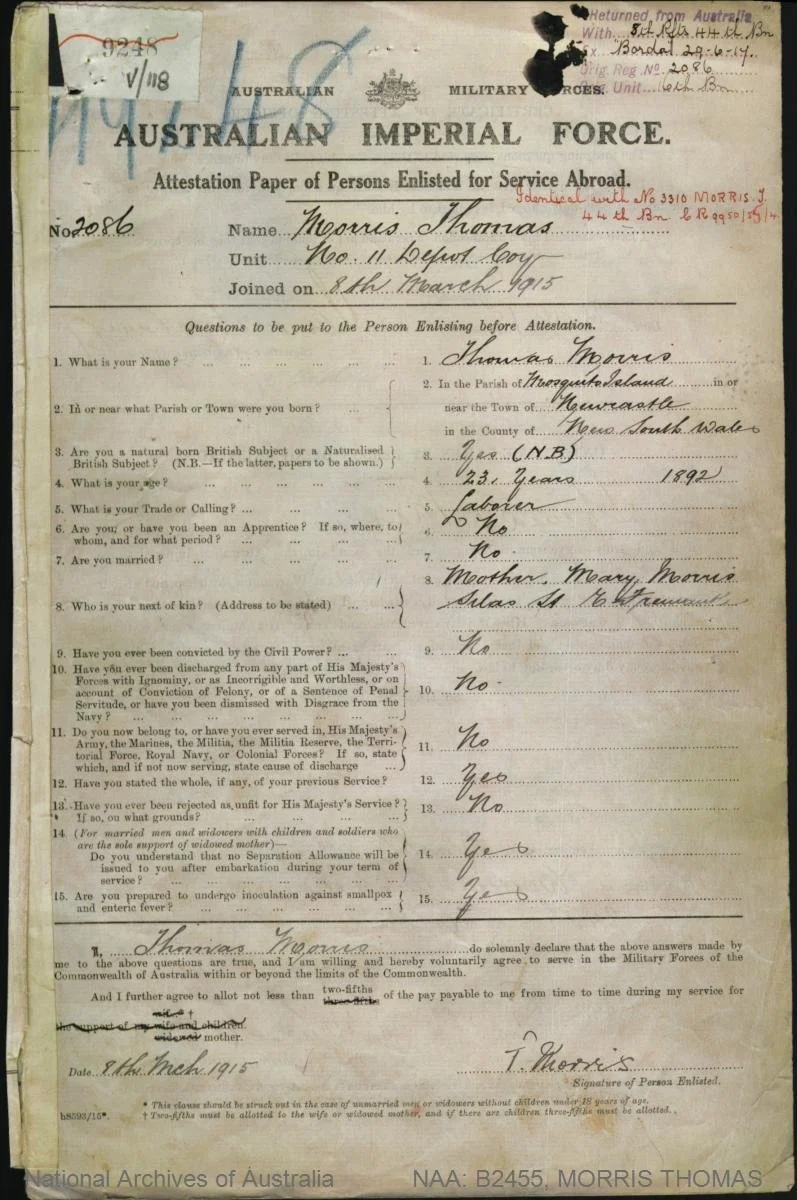 MORRIS, Thomas Adolphus, Private, 44th Battalion