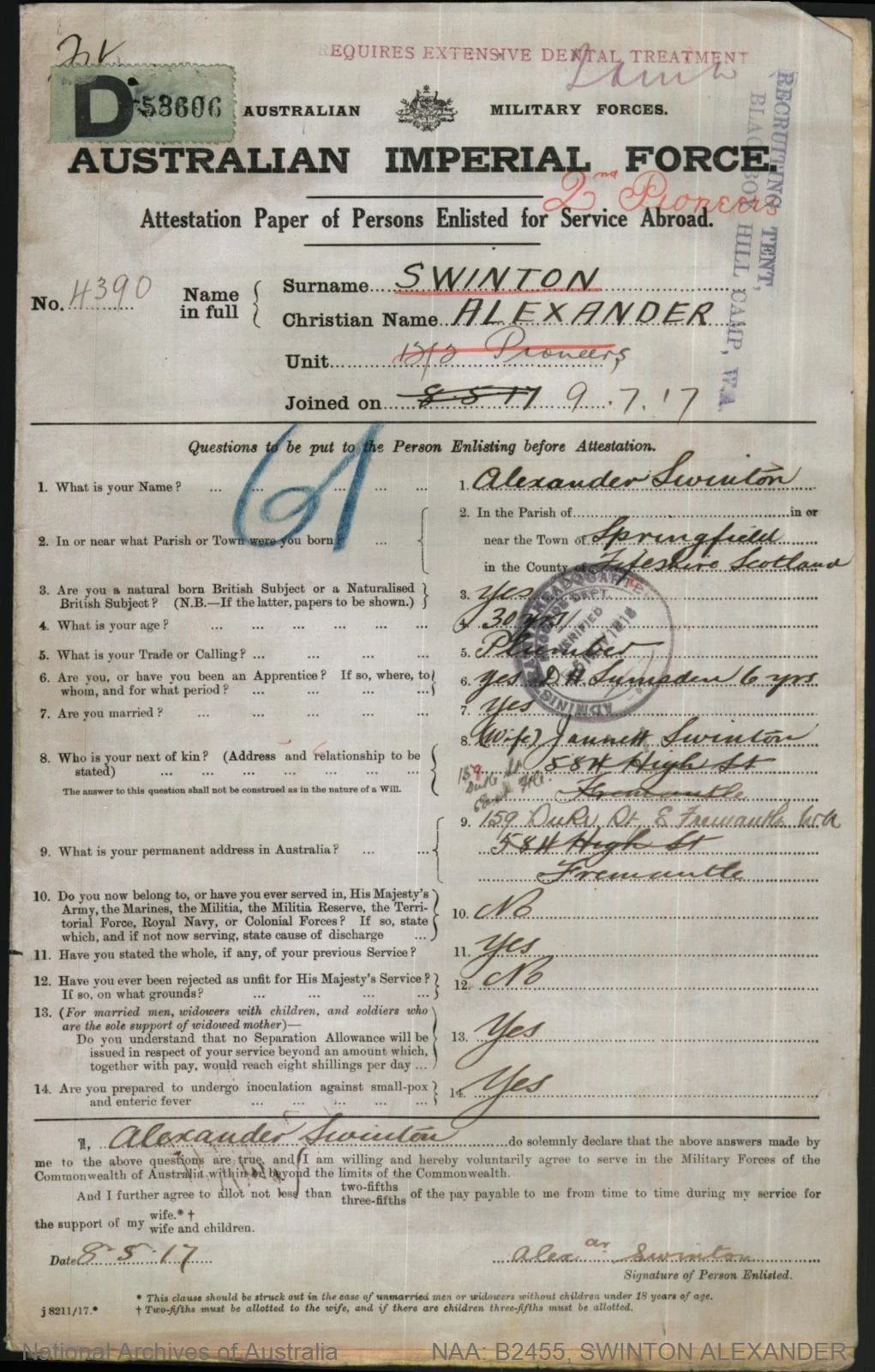 Son of Alexander and Mary Muir Swinton; Husband of Janet Coen (formerly Swinton) of 20 Allen St, East Fremantle, WA. Born In Scotland. Soldier was admitted to the Sutton Very Military Hospital on 25 Jun 1918 with Influenza. One week later he was discharged. KIA in France 5 Oct 1918.