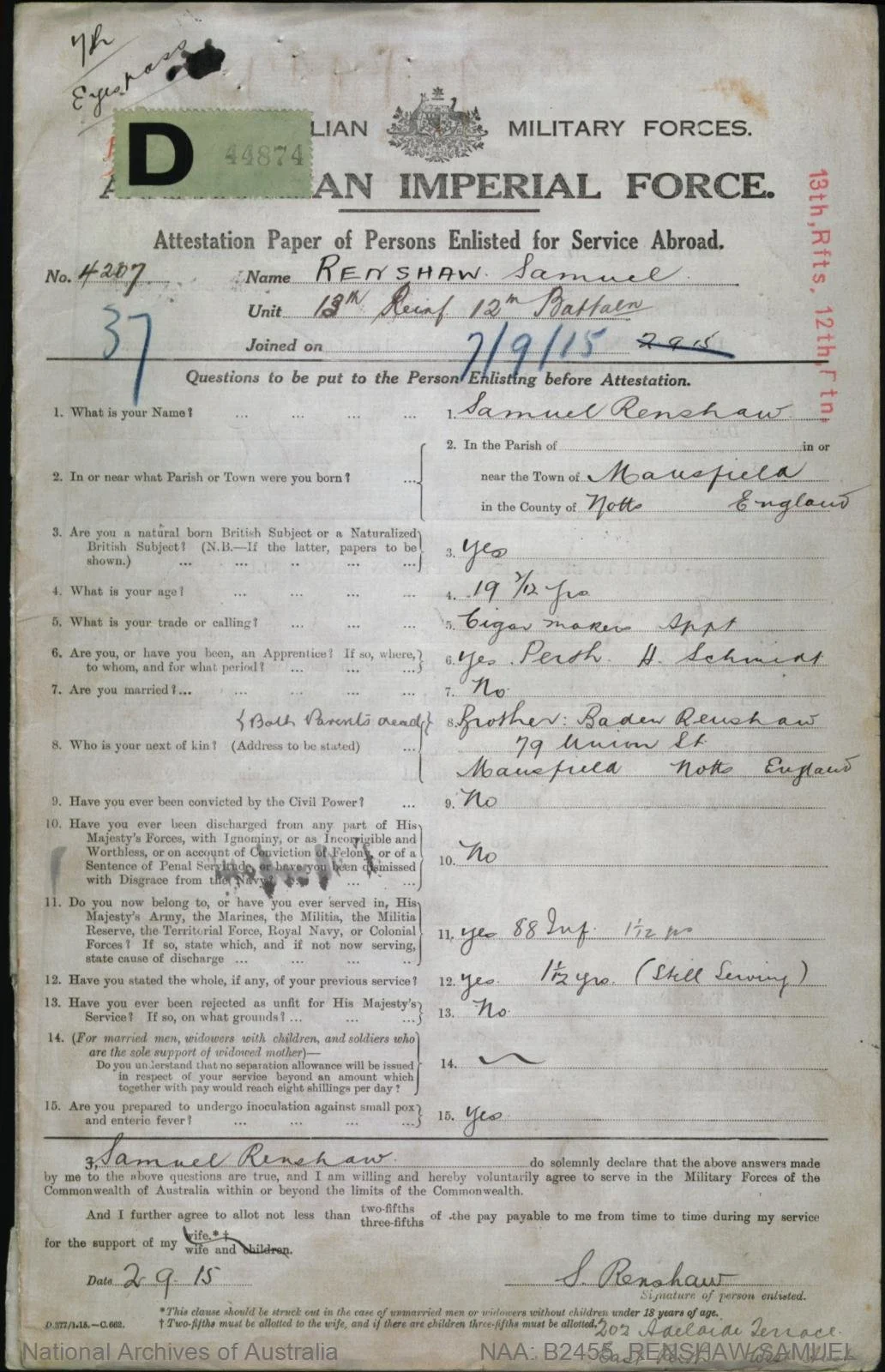Enlistment Date: 7 October 1915