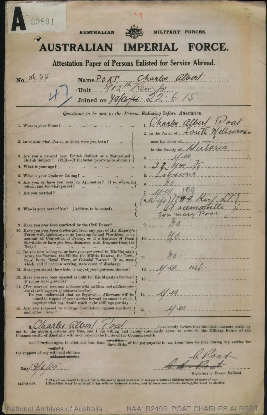 POAT, Charles Albert, Private, 12th Battalion