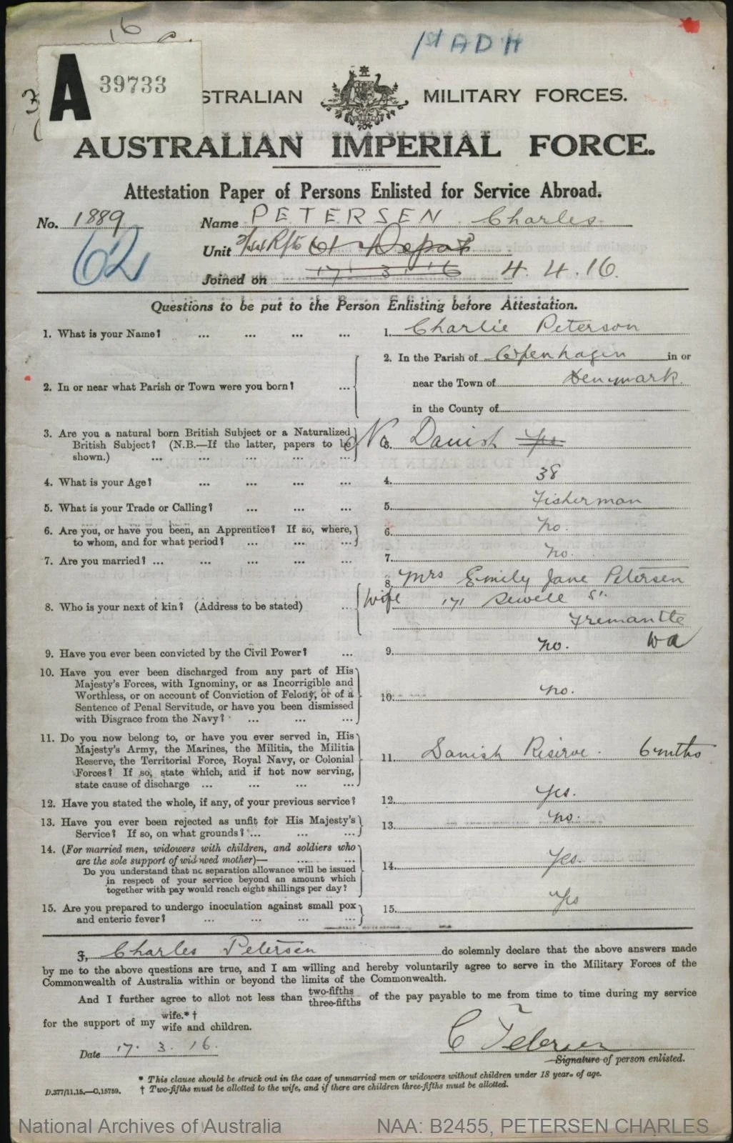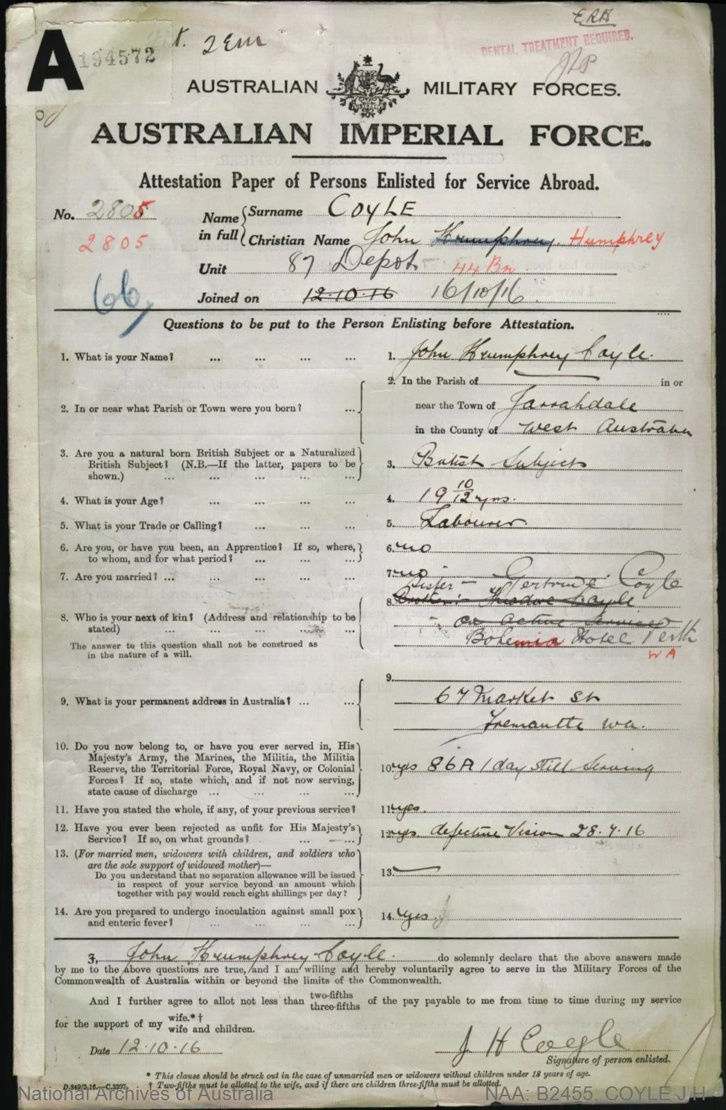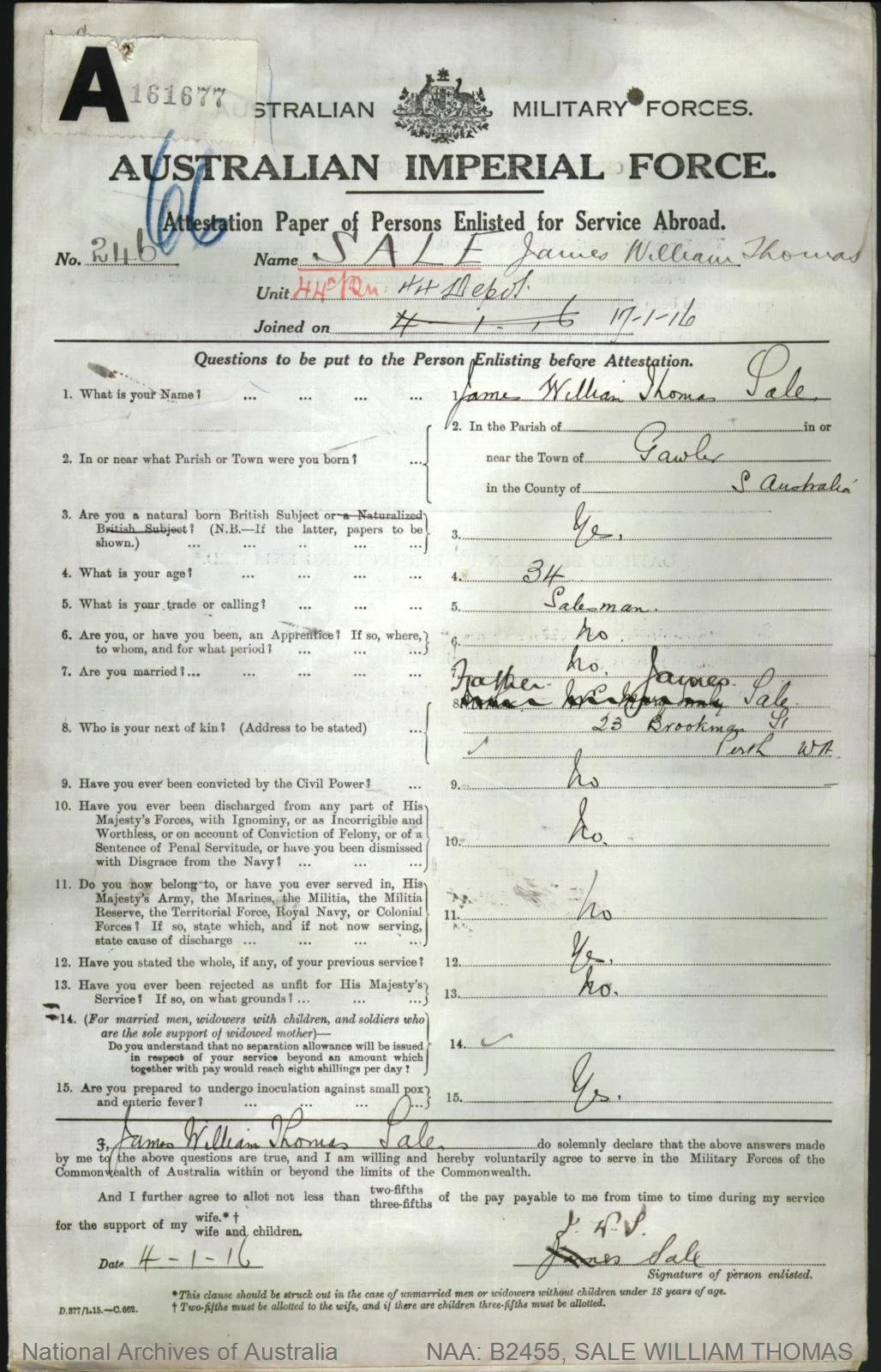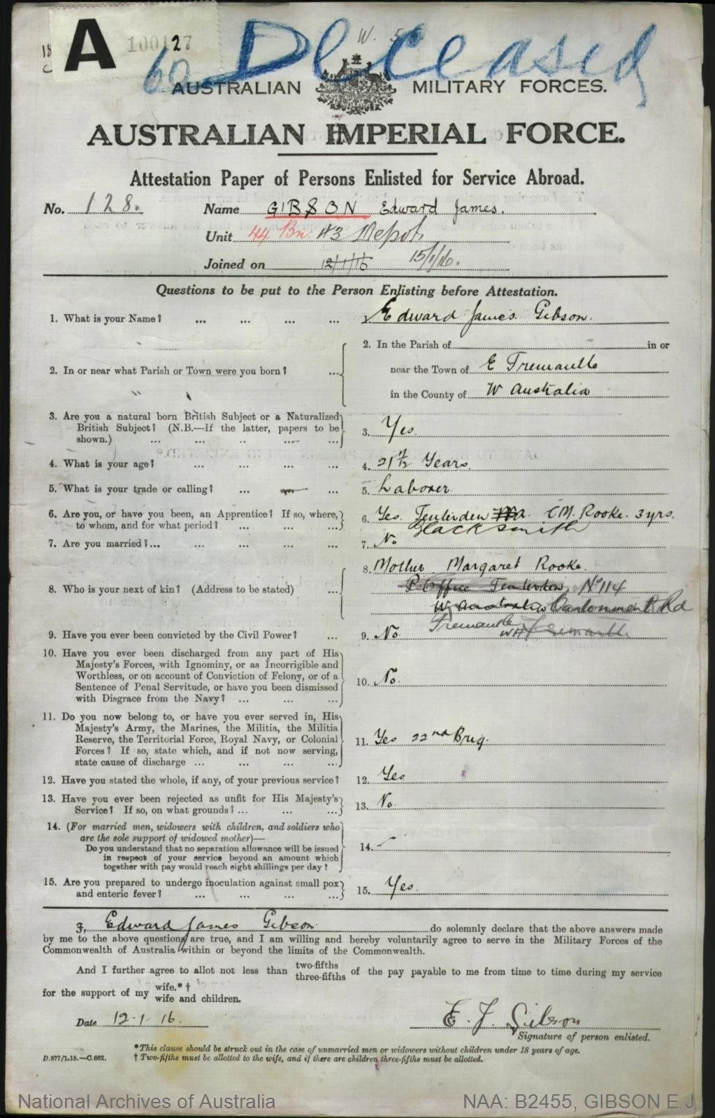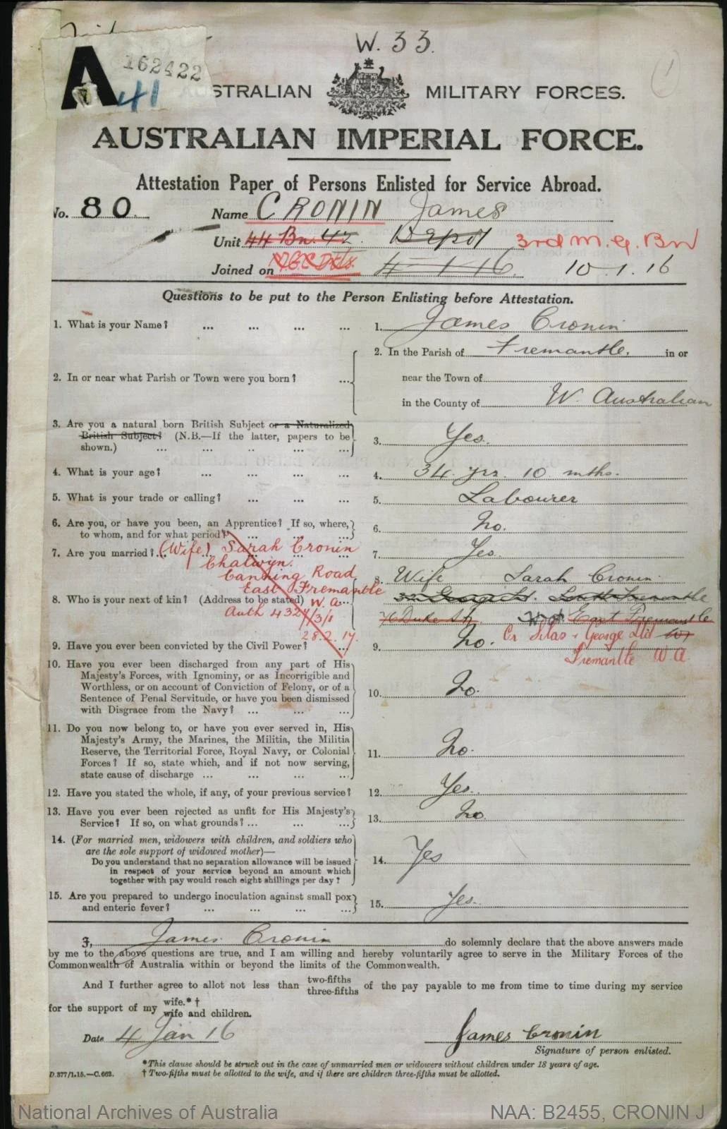 George Arthur Morris (1896-1970), nick-named ‘Skinny’, Service Number 4655, enlisted in November 1915 and embarked on the HMAT Miltiades (A28) on 12 Feb 1916 from Fremantle with the 11th Battalion. He then transferred to the 10th Light Horse Regiment, in Egypt, to be with Reg, but Reg was soon transferred to the 3rd Light Horse Regiment. Both then transferred to Artillery. George was hospitalised with VD (Gonorrhoea) in July 1916. In September 1916 he and Reg were both absent without leave and served their punishment together. In May 1917 he was deemed fit for Permanent Base after it was found he was deaf, and was discharged and returned to Australia. He married Doris Hopetoun Pridmore in June 1922, and had two sons. One, George ‘Arthur’ Morris Jr married Phyllis Weston (see Notable People) in Kalgoorlie in 1946 and they are Raymond Morris’s parents- lived at 89 Duke st. (Reference)