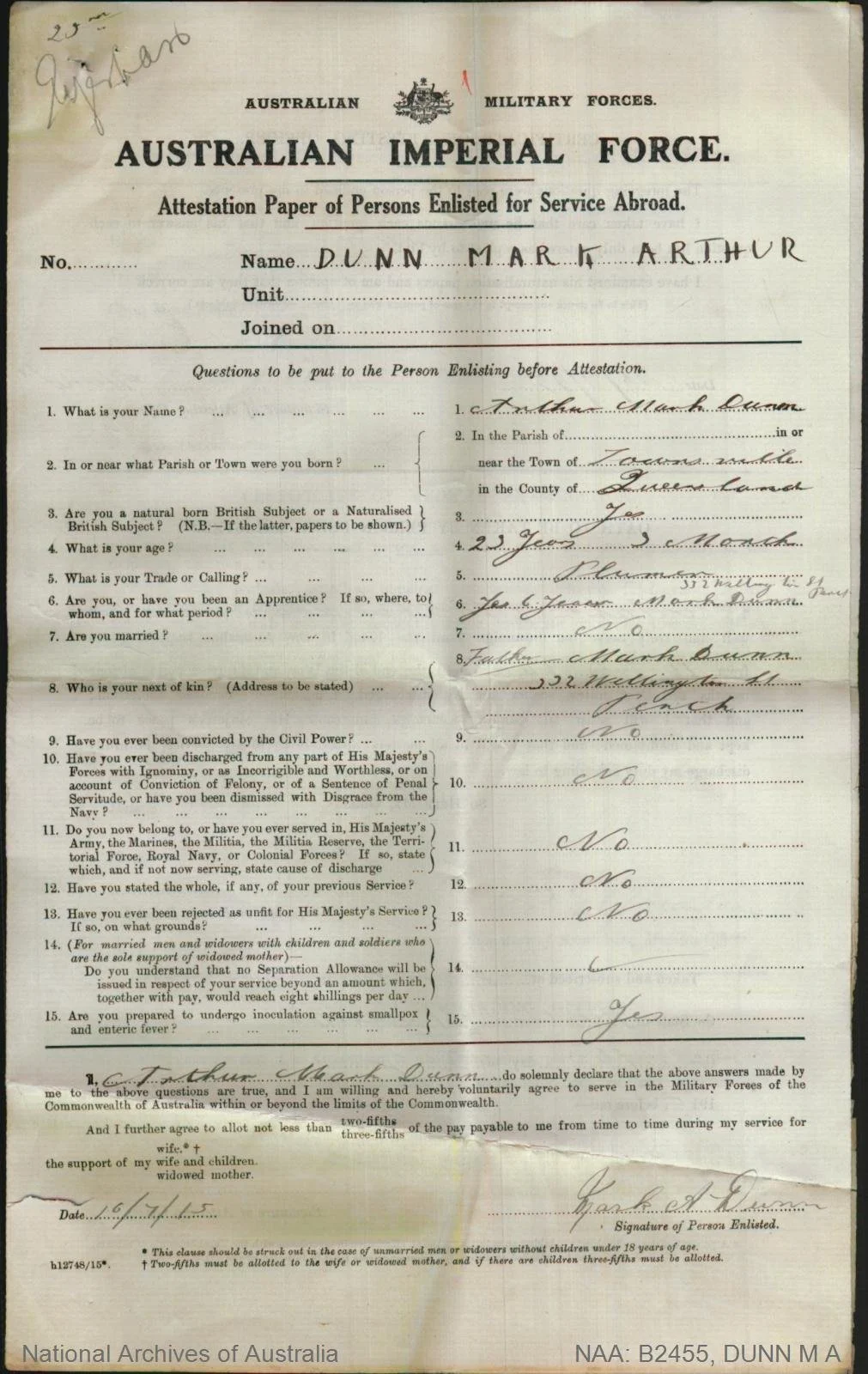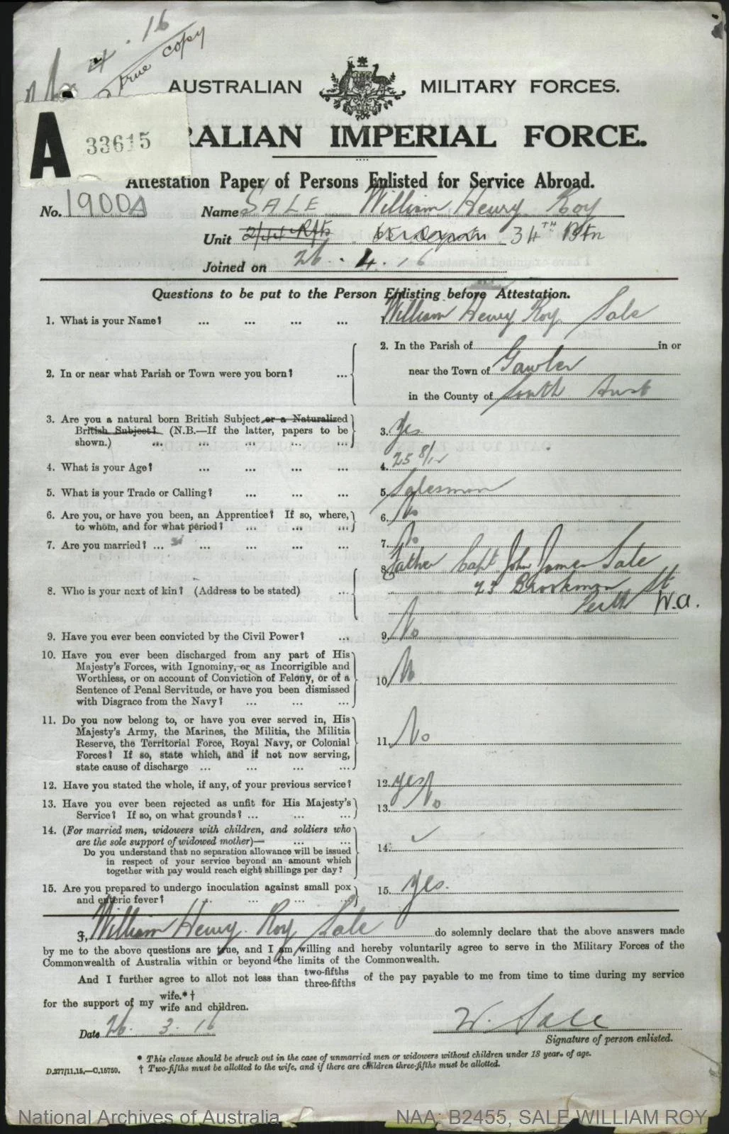 Gunner, Sergeant, Lieutenant Neil Miller (#1796) embarked 31 October 1914 aboard HMAT Medic (A7) from Fremantle and served with 8th Field Artillery Battery, the 35th Fortress Company Australian Engineers 4th Division, and Australian Army Ordnance Corps. He was awarded the Distinguished Conduct Medal in 1917. (Reference)