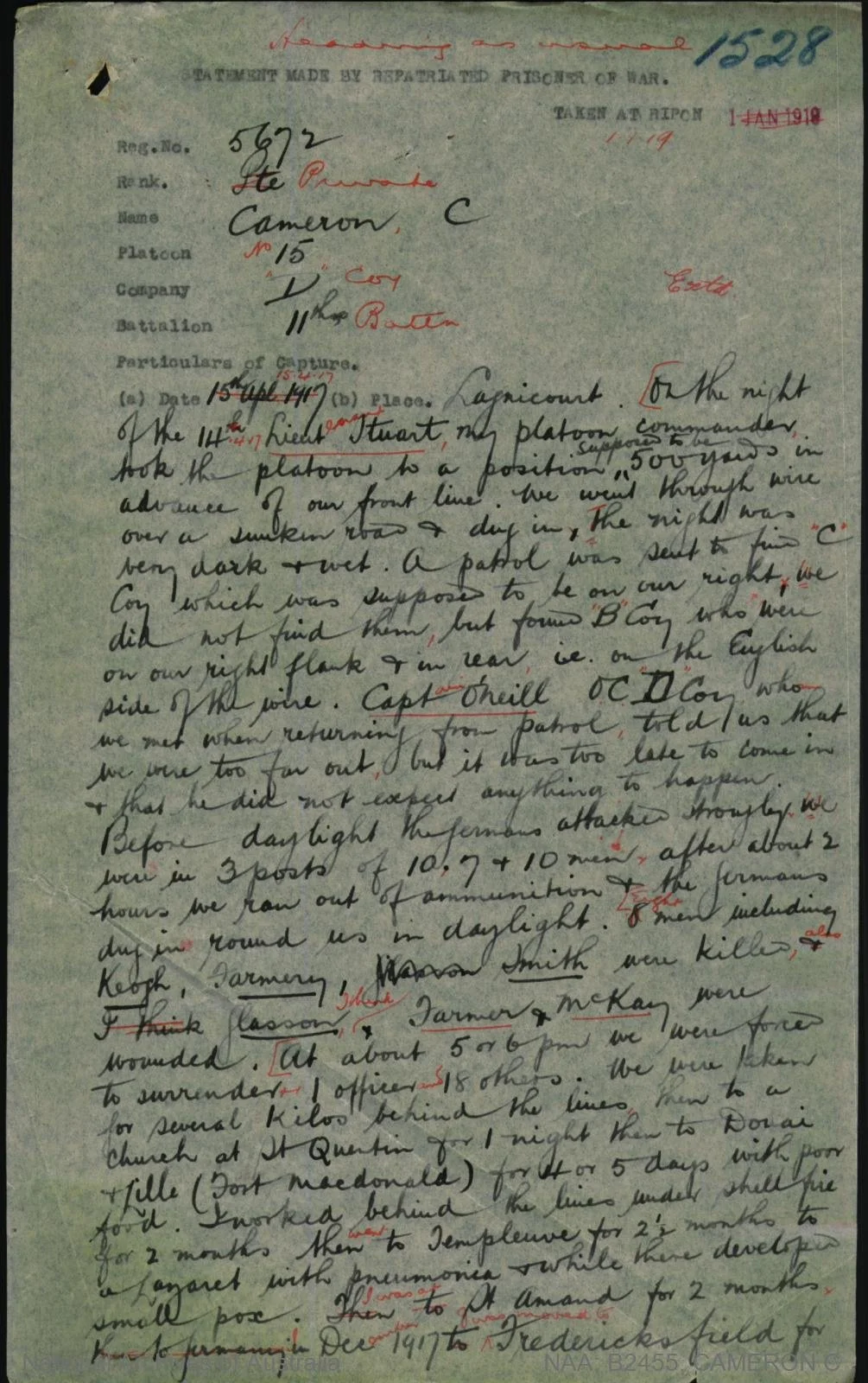 15/4/17 Cameron was captured by the Germans at Boursies and eventually sent to Germany as a prisoner. This was his statement.