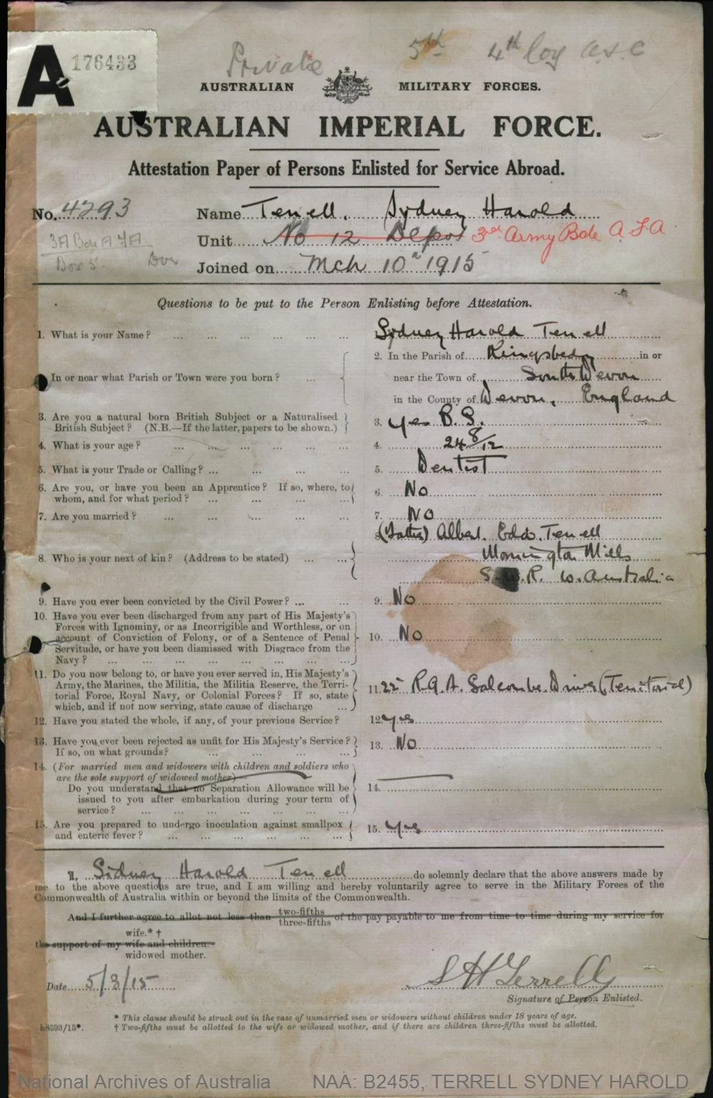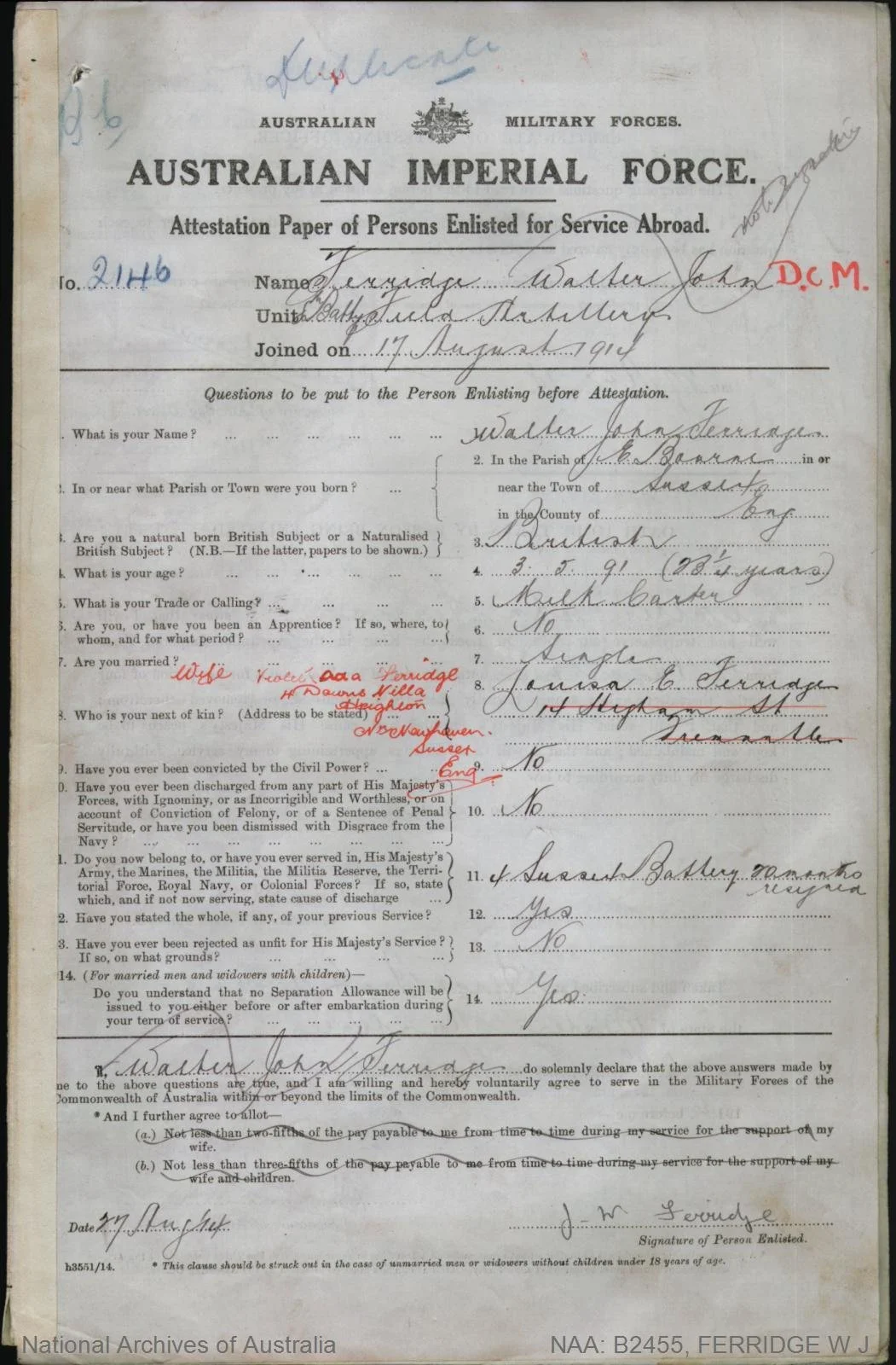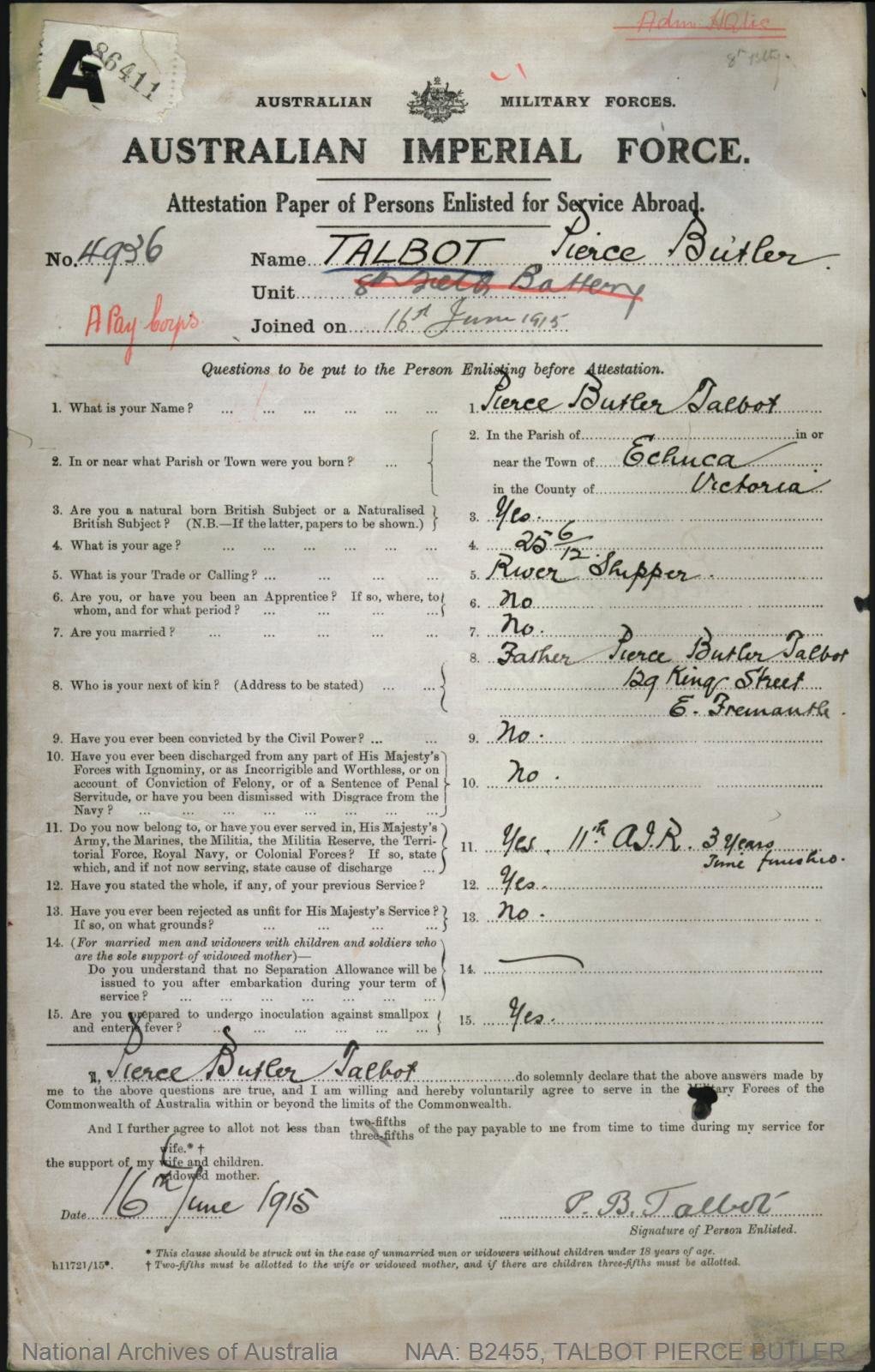 Born in Happy Valley, South Australia, Pat Gallagher a twenty two year old telephone mechanic, was living with his parents, Edmund and Mary, in North Fremantle when he enlisted in the AIF on 13 September 1915. He was twenty two years old.