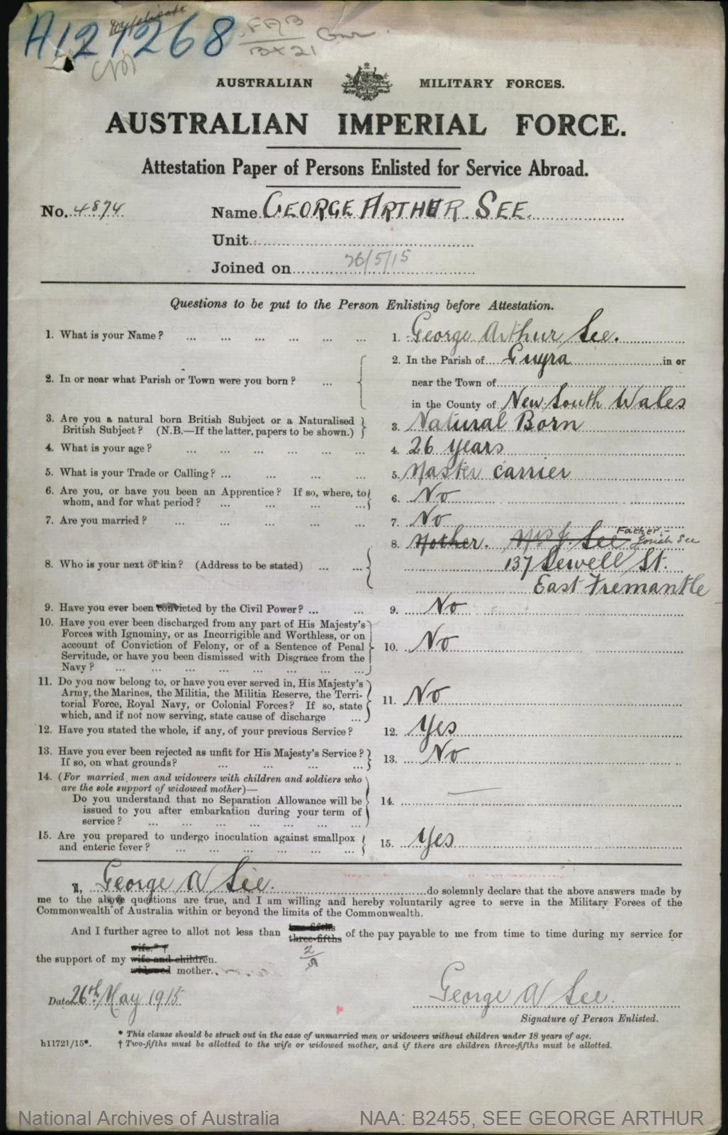 SEE, George Arthur, Private, No 1 Australian General Hospital