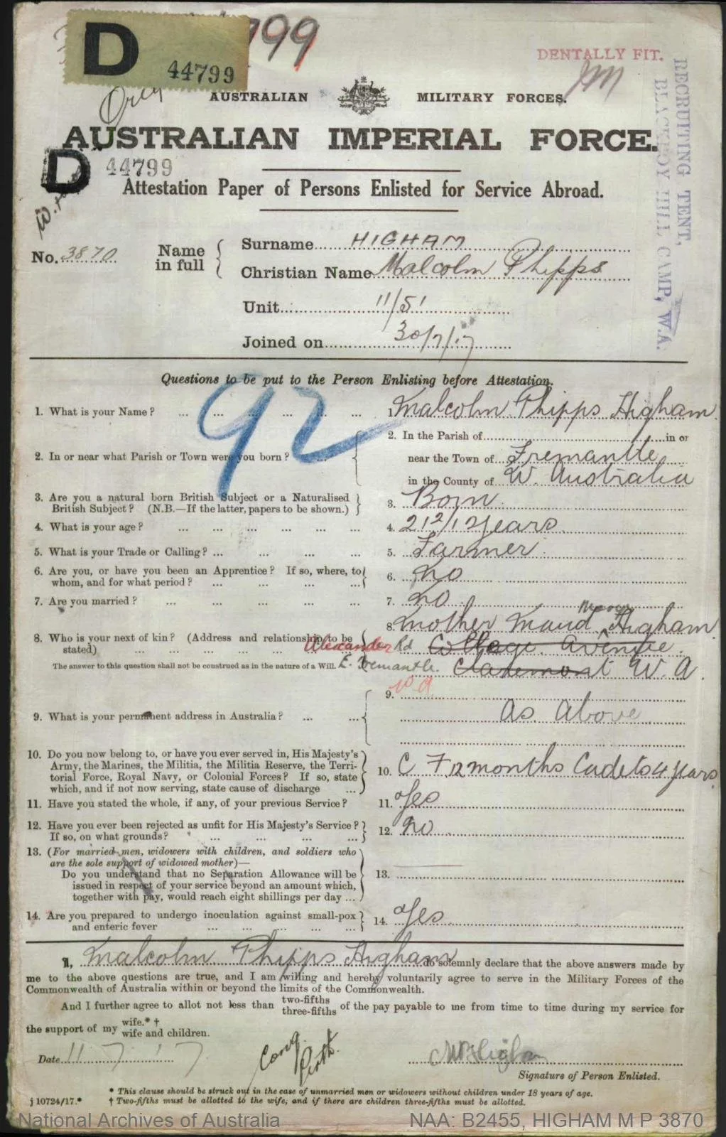 Second youngest son of Harry James William (died 1917) and Maud Mary (Bateman) Higham of 32 Alexandra Rd, East Fremantle, WA. First cousin of Ernest Higham (mother Maud was also sister to Edith, above, reinforcing the bonds between these merchant families). The family held land at Barramining, near Williams (father Harry and sons were all pastoralists or farmers). Malcolm was working there when he enlisted. The family also owned a home in College Avenue, Claremont, where he attended Scotch College with his brothers and cousins.