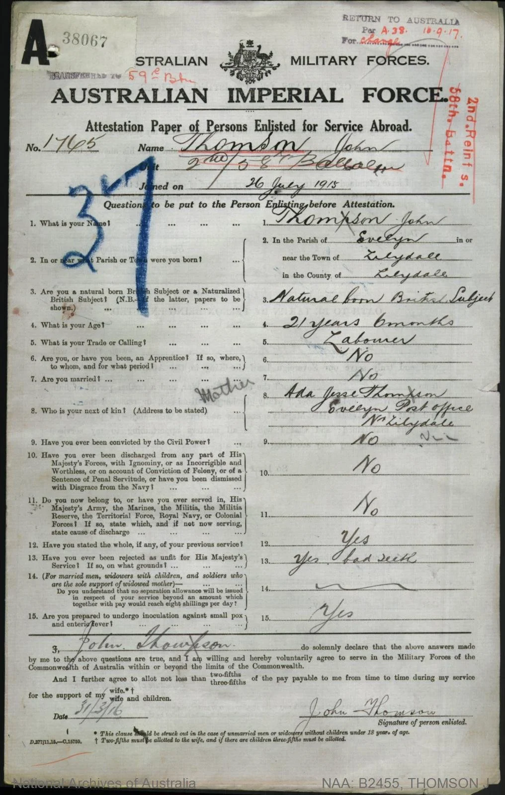 THOMSON, John, Private, Australian Stationary Hospital 2