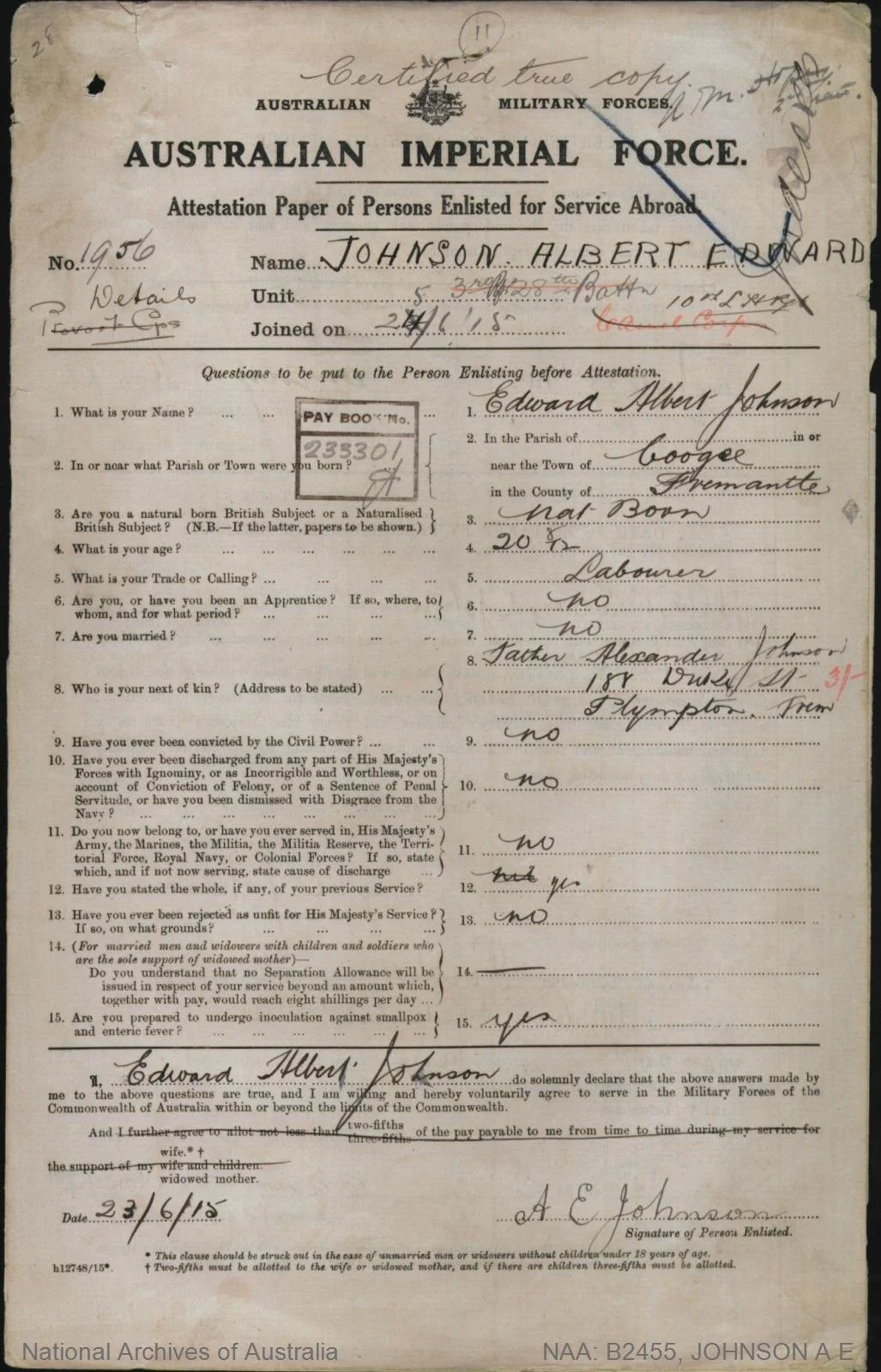 Malcolm Higham took the oath at Perth on 11 Jul 1917, then on 30 Jul was allotted to the 11th Reinforcements, 51st Battalion. Training began in WA, then they were sent to Melbourne, departing for England on the Aeneas on 30 Oct. They reached England two days after Christmas and settled into Codford Camp with the training battalion.