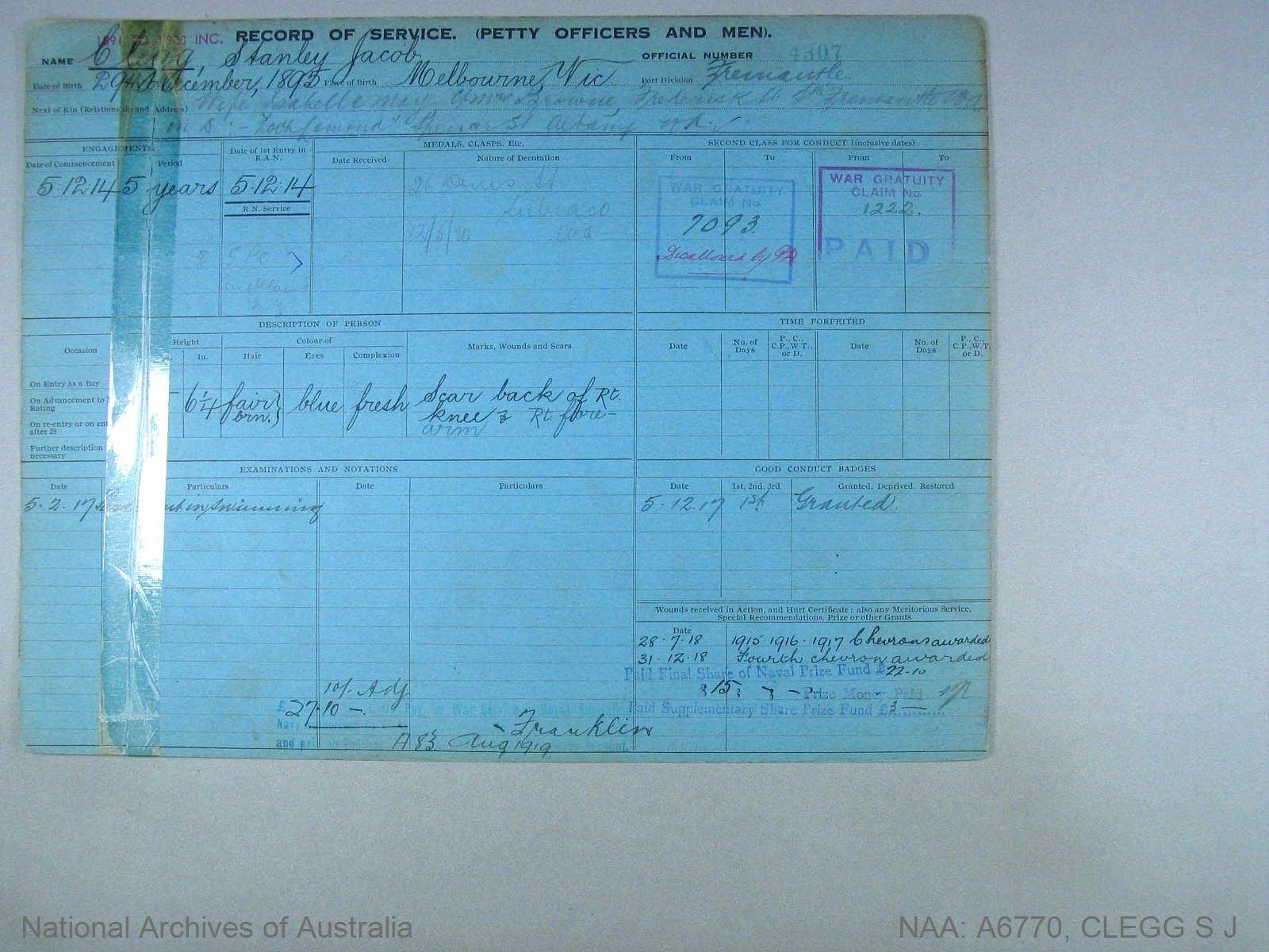 In 1917 Cyril was promoted to sergeant and, in 1919, returned to Australia. He returned to the family business for a short time before moving to Melbourne for work. In 1925 Cyril married Sheila Lillian Harvey, after which they returned to WA and Cyril took up a position of Chief Steward for State Steamship Line. In 1928 their first son Phillip was born. Phillip followed in his father's military footsteps and was accepted into the Royal Military College Duntroon. (reference). Phillip eventually reached the rank of general and Chief of the Defence Force and, after retiring, went on to become Governor of Tasmania. A second son, Peter, followed in 1930. Peter also attended Duntroon, choosing to pursue a post war career with the RAAF as a navigator. (reference)