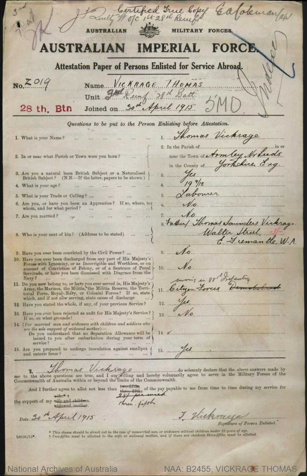 VICKRAGE, Thomas, Private, 28th Battalion