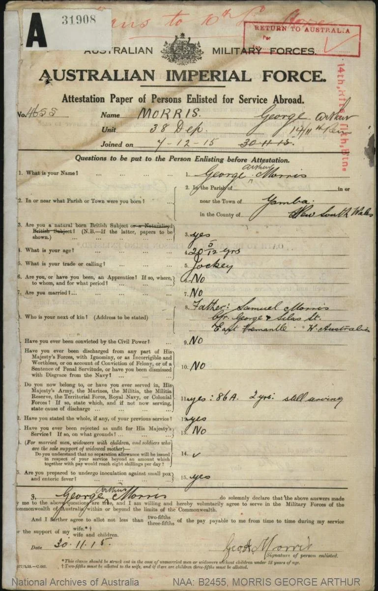 Of Samuel and Mary’s four sons, the second eldest Samuel Stanley Morris Snr. (b.1889) was married with one child and did not enlist in WWI but the other three sons (Reginald Walter, Thomas Adolphus and George Arthur) all enlisted, giving their next of kin as either one of their parents at Silas Street. Reginald and George listed their occupations as jockeys and were initially taken into the Light Horse before transferring together to Artillery. Thomas was a labourer. While not exemplary soldiers the three brothers, and their brother in law made a huge contribution to the war effort. Their war records give a realistic account of life as working class and single men experiencing war in Europe. Perhaps with a ‘larrikin’ spirit- Reg and George made an effort to fight together when they could, and all three returned from the War.