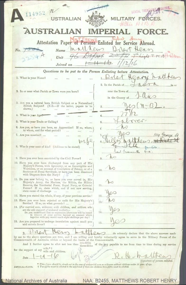 George Arthur Morris (1896-1970), nick-named ‘Skinny’, Service Number 4655, enlisted in November 1915 and embarked on the HMAT Miltiades (A28) on 12 Feb 1916 from Fremantle with the 11th Battalion. He then transferred to the 10th Light Horse Regiment, in Egypt, to be with Reg, but Reg was soon transferred to the 3rd Light Horse Regiment. Both then transferred to Artillery. George was hospitalised with VD (Gonorrhoea) in July 1916. In September 1916 he and Reg were both absent without leave and served their punishment together. In May 1917 he was deemed fit for Permanent Base after it was found he was deaf, and was discharged and returned to Australia. He married Doris Hopetoun Pridmore in June 1922, and had two sons. One, George ‘Arthur’ Morris Jr married Phyllis Weston (see Notable People) in Kalgoorlie in 1946 and they are Raymond Morris’s parents- lived at 89 Duke st. (Reference)