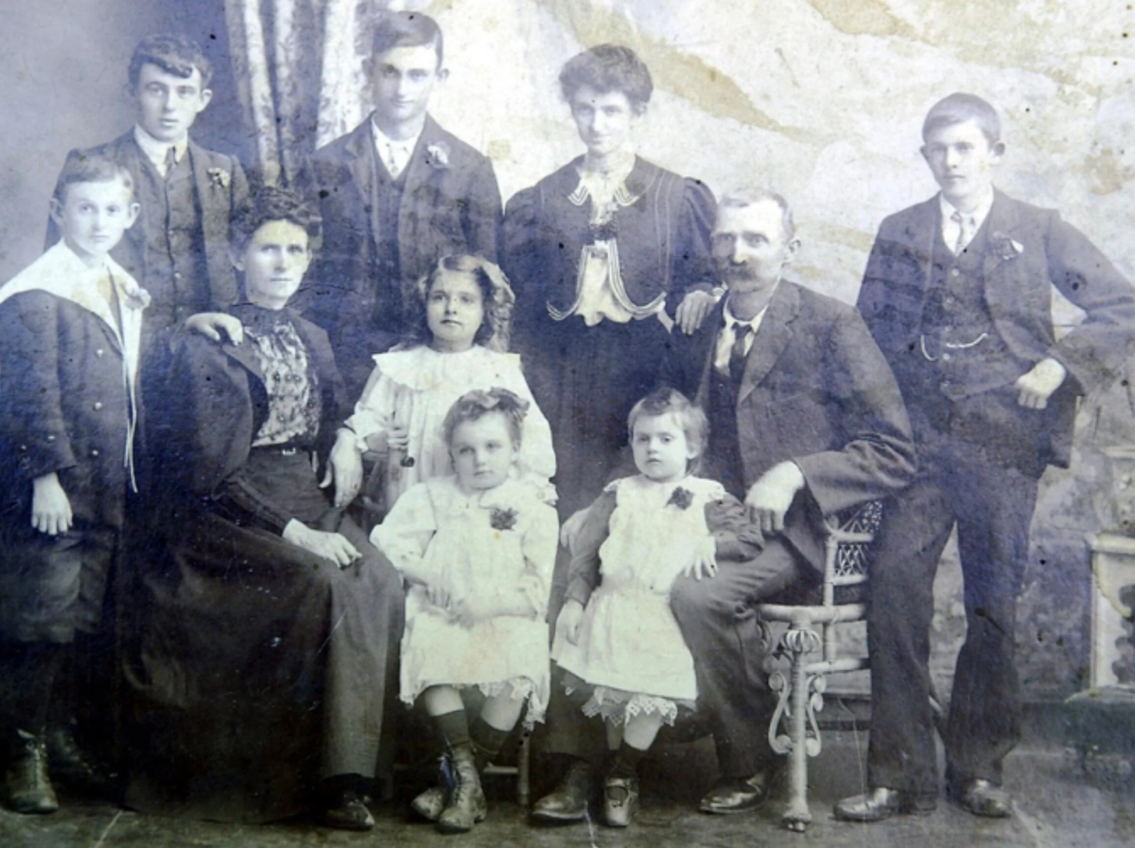 Family portrait c 1905/6 Standing, Left to Right: George Arthur Morris (b.1896), Reginald Walter Morris (b.1887), Samuel Stanley Morris (b.1889), Maggie May Morris (b.1888) and Thomas Adolphus Morris (b.1892) - they're around and across the back of Mrs Mary Morris (nee Ryan) sitting on the left and Samuel Morris on the right. The girl in the centre of the photo is Mary Alice Morris (b.1899), Anna Eileen Morris (b.1901) is front left, and Nora Kathleen Morris (b.1904) is front right.
